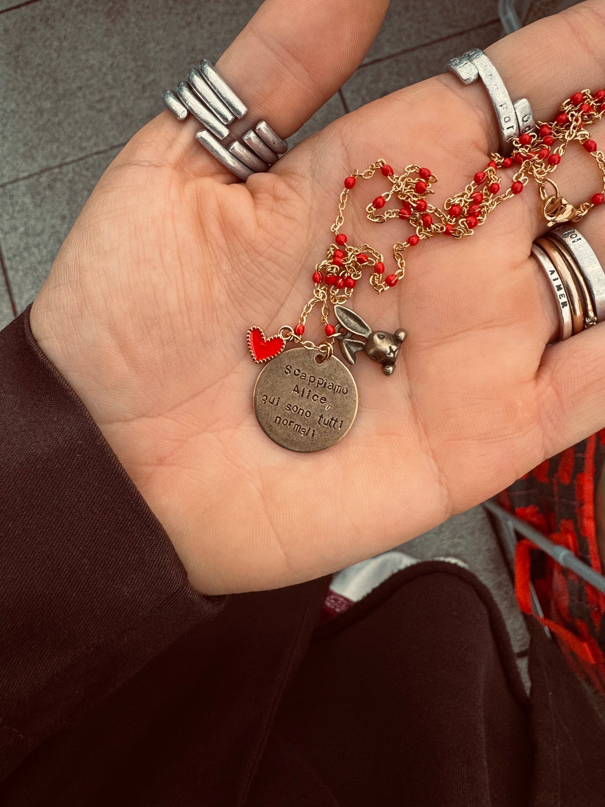 La collana è composta da: catena in acciaio di circa 63 cm, ciondolo inciso, ciondolo coniglietto ed un ciondolino aggiuntivo che può essere un cuoricino o una nappina.
